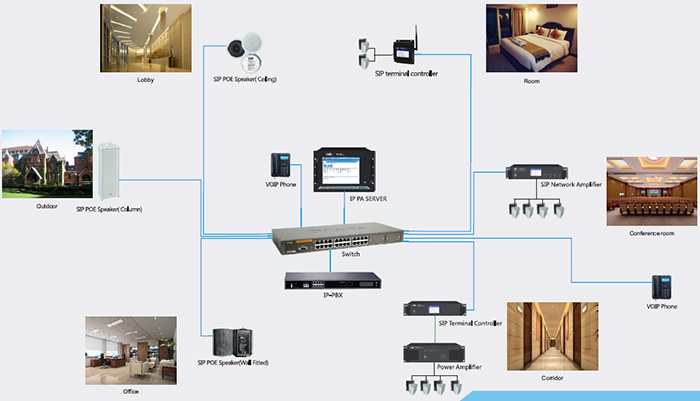 SIP公共廣播的作用主要是播放背景音樂,用VoIP話機尋呼找人,同時你也可以用VoIP話機進行雙向對講。其可以廣泛應用于學校、商場、醫院、小區等等。