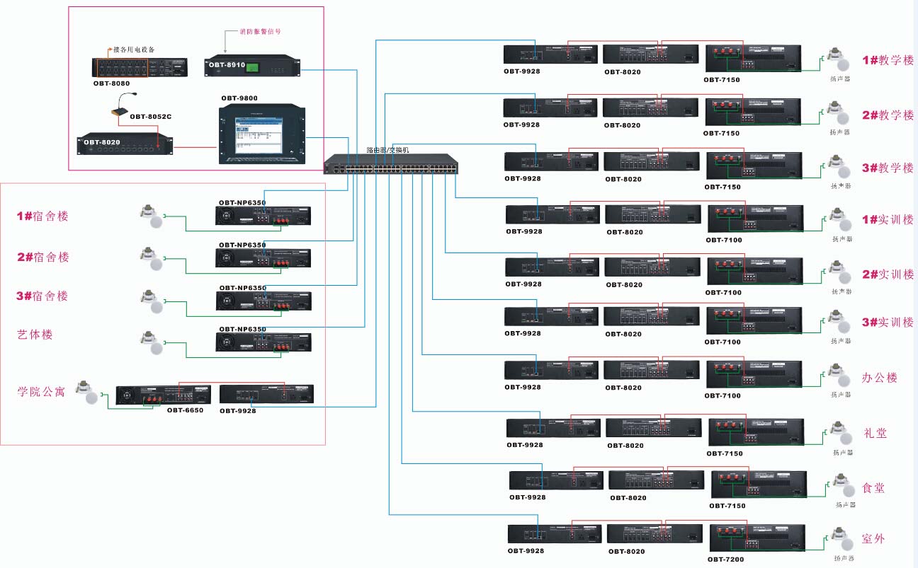 1)具備有分散式和集中式管理模式,分散式是在學(xué)校4個校區(qū),每個廣播區(qū)域(教學(xué)走廊、室外走道、宿舍走廊、戶外運動場、學(xué)生食堂、校園周邊環(huán)境帶等區(qū)域)設(shè)置網(wǎng)絡(luò)音頻終端,滿足各個教室、各個區(qū)域可以進(jìn)行獨立廣播和控制;集中式是在學(xué)校總廣播站設(shè)置系統(tǒng)服務(wù)器、及各分控站,利用學(xué)校網(wǎng)絡(luò),把各個區(qū)域廣播音頻終端、網(wǎng)絡(luò)尋呼站和分控軟件操作系統(tǒng)連接起來,組成一套數(shù)字化網(wǎng)絡(luò)廣播系統(tǒng),進(jìn)行統(tǒng)一管理;